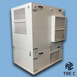Les panneaux acoustiques qui composent la cabine sont réalisés pour assurer l’entretien des équipements situés à l’intérieur, la ventilation, la protection contre les intempéries et la sécurité incendie.